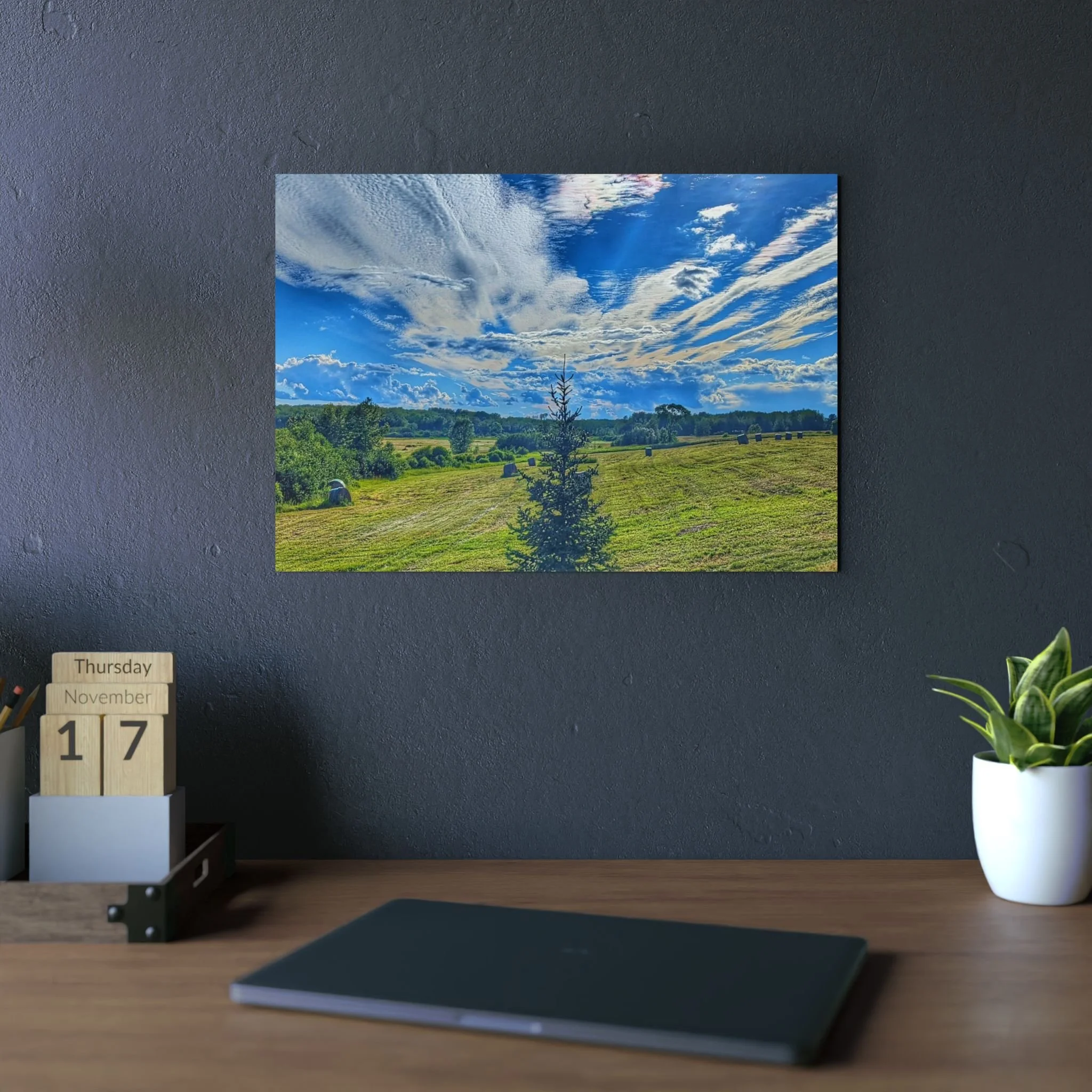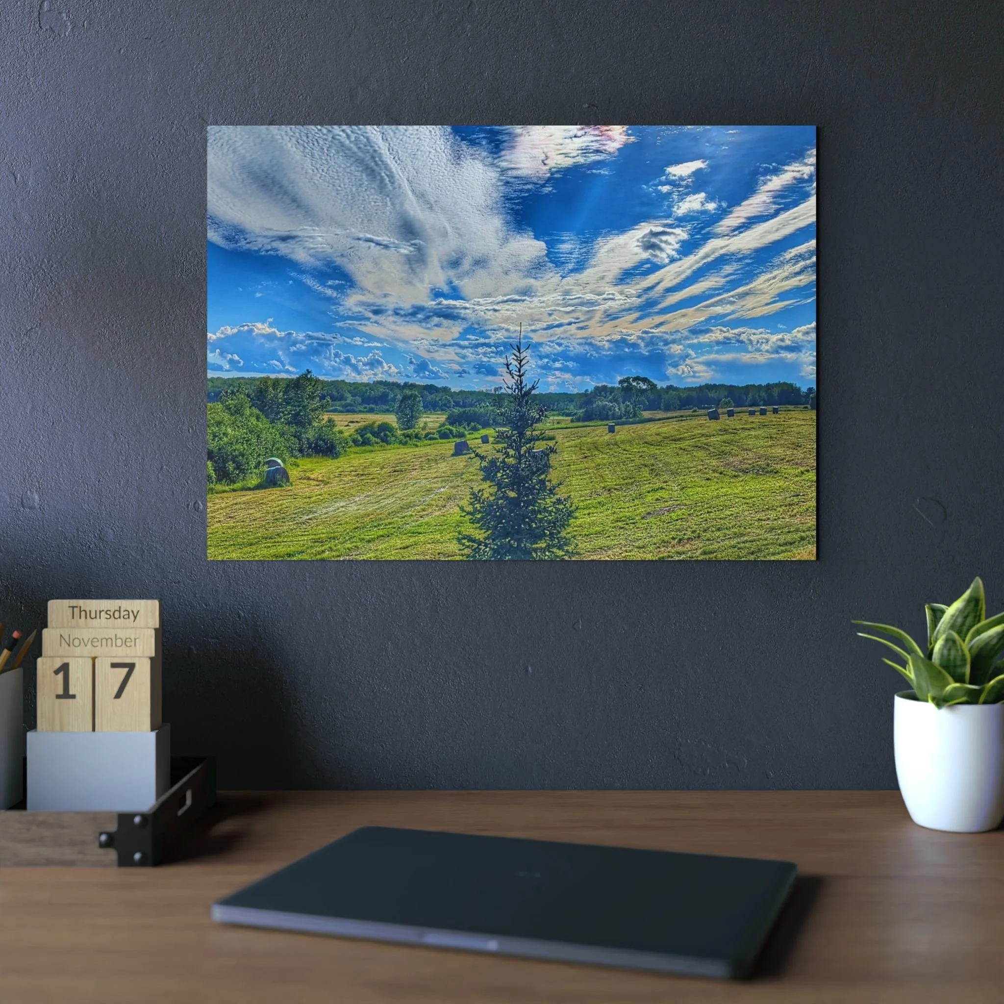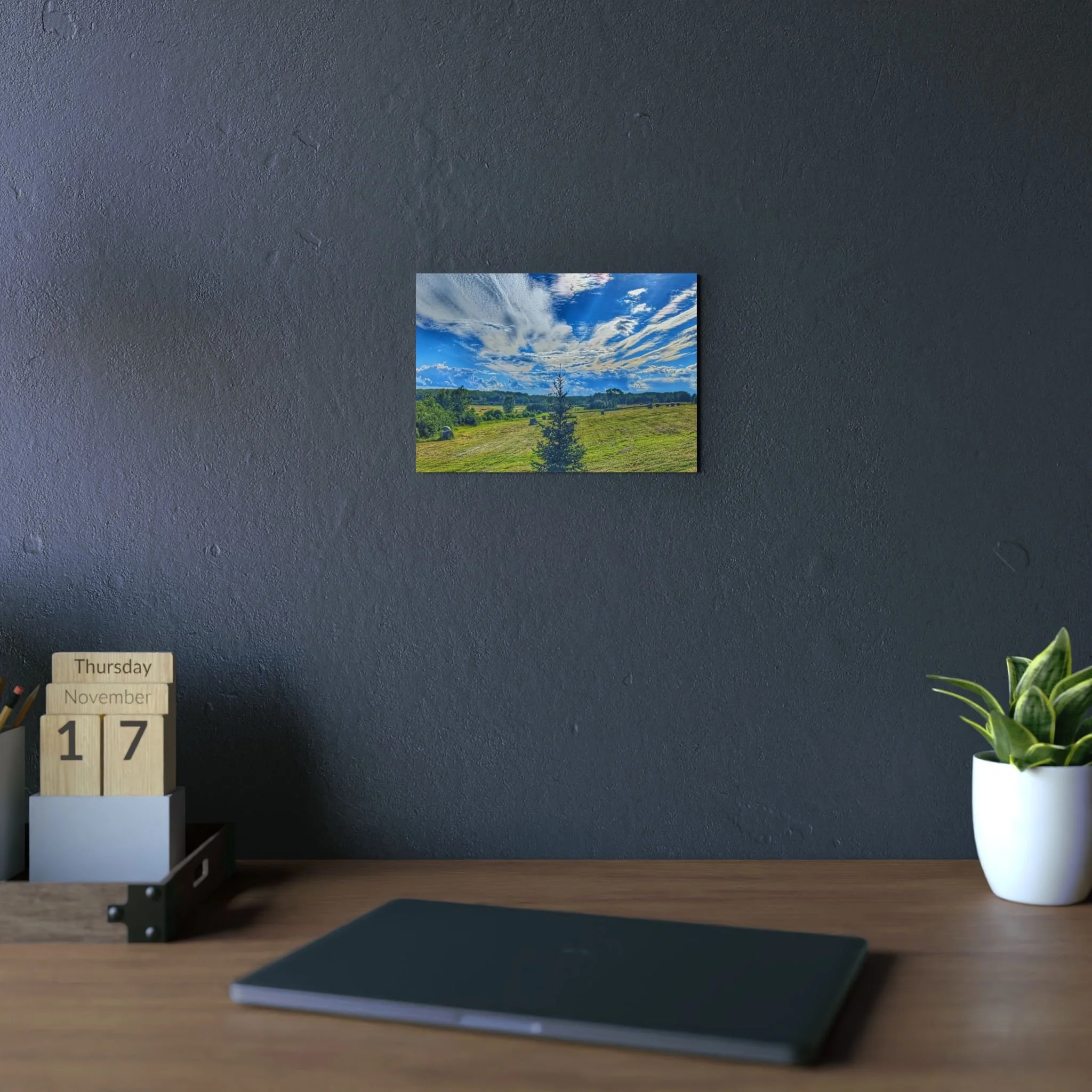 A slim, weather-ready aluminum panel. The matte surface tames glare so the soft rays and warm horizon read like a memory instead of a photograph. Lightweight but sturdy, it hangs straight from the pre-mounted metal hanger and the bumpons keep it steady against the wall — an easy way to bring a quiet, rural evening into a home office, hallway, or covered porch. Colors stay true outdoors thanks to UV-resistant inks, and the 3mm composite core keeps the piece rigid without feeling bulky. Choose a size that fits your wall and enjoy the sunset no matter what time of day.