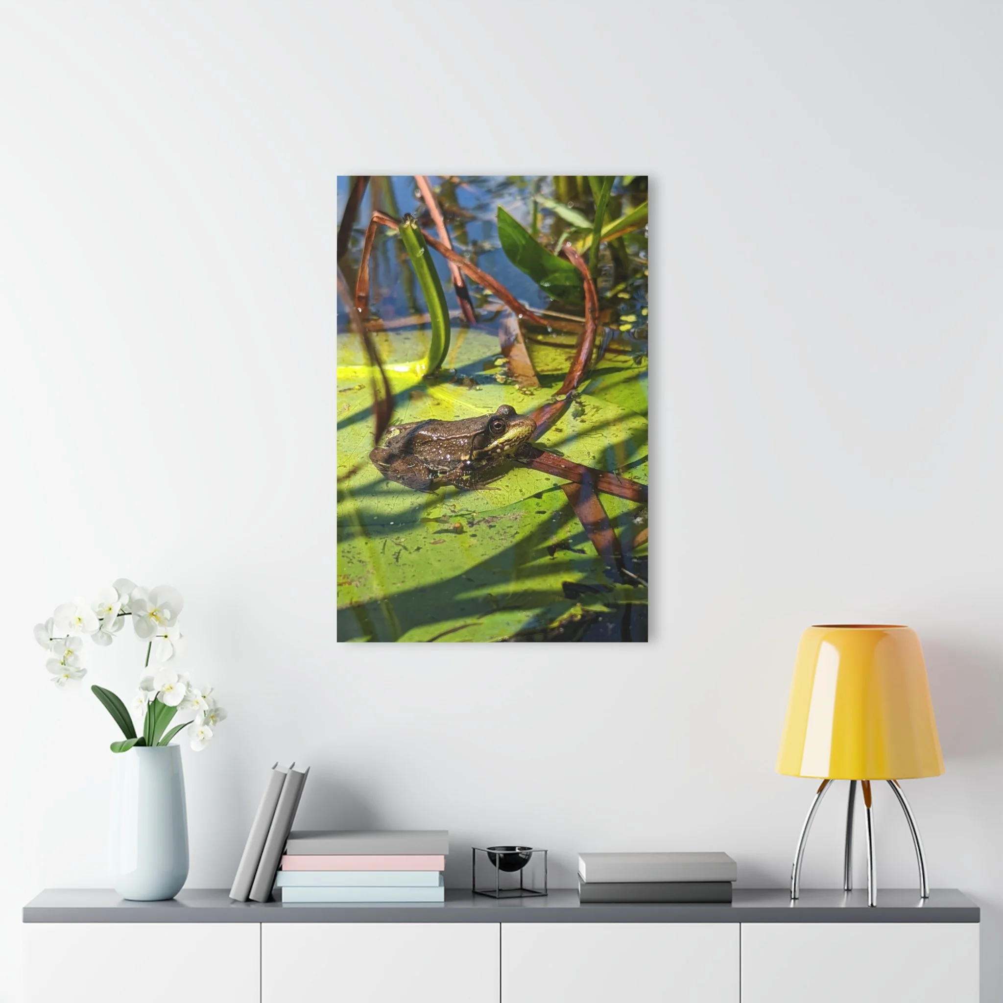 Sun-warmed marshes and the hush of summer evenings—this acrylic print brings a close-up moment from a watery world into your home. A tiny frog rests among lily pads and reed shadows, captured in crisp, glossy detail on polished acrylic that intensifies color and depth. The clean white backing and crystal-clear edges make the image feel like a window into a pond, while the secure french cleat system keeps it mounted flush against the wall.