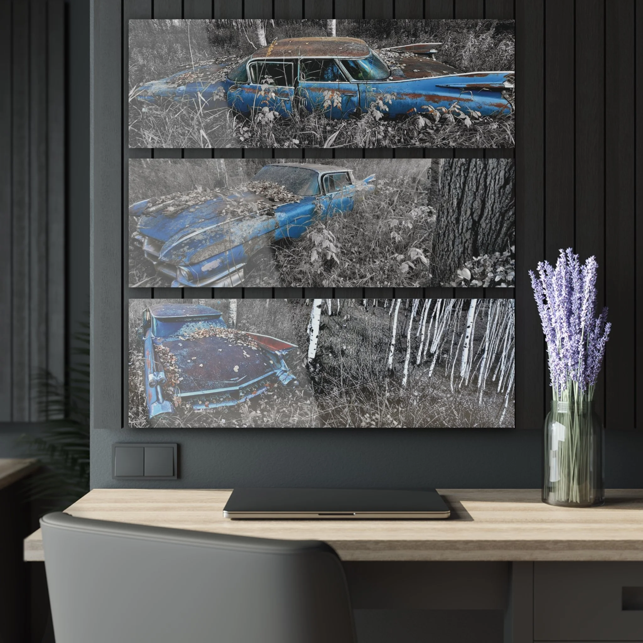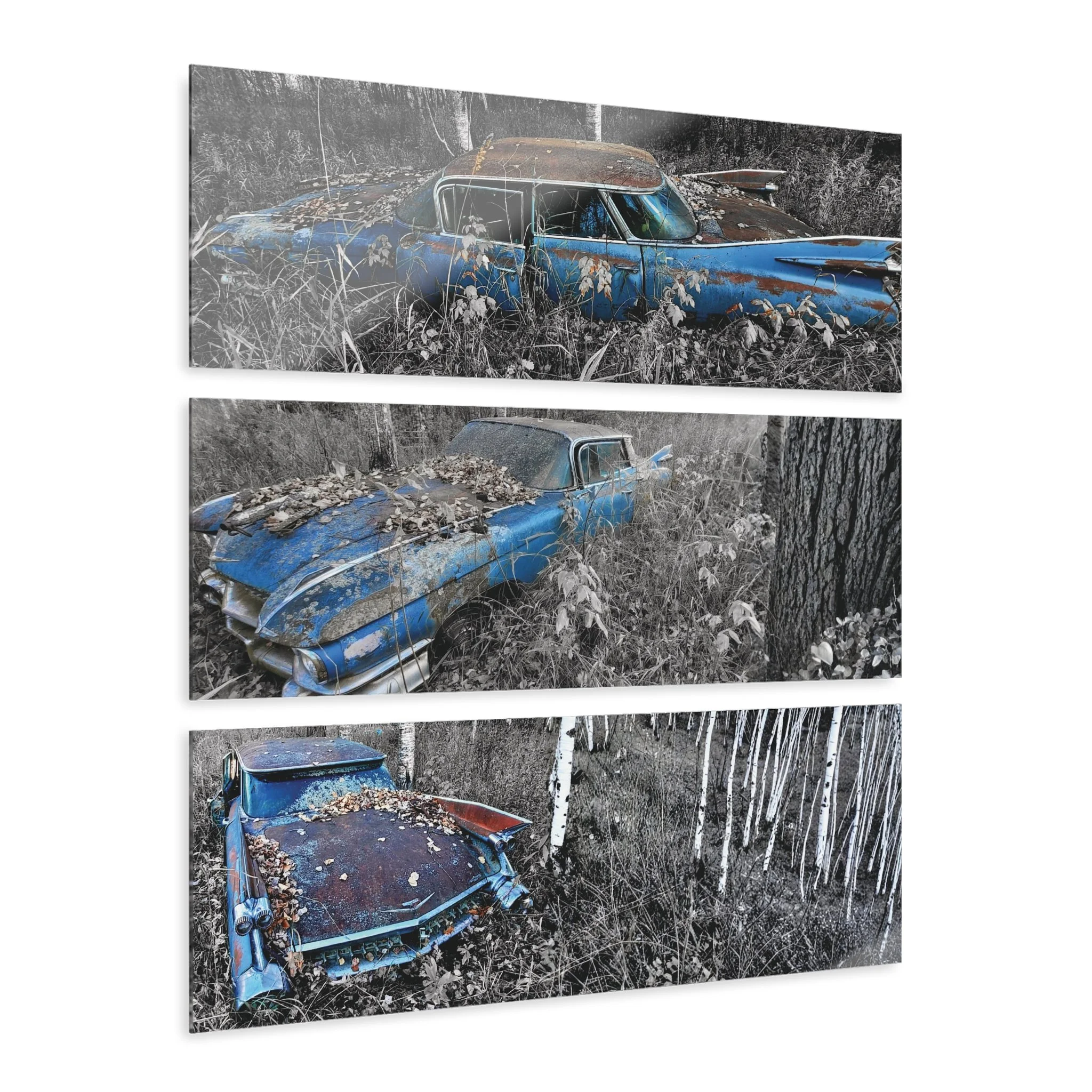 Three slender panels capture a forgotten vintage Cadillac slowly reclaiming the earth — blue paint bleeding into the grasses, chrome peeking through moss and leaf litter. Mounted on glossy acrylic, the triptych brings cinematic depth and crisp detail to a hallway, studio, or living room wall. The cool, desaturated background tones and the single ribbon of blue draw the eye across all three pieces, creating a quiet, nostalgic moment that settles into a room without shouting. Hang it low over a console or stagger it above a sofa to invite lingering looks and conversation about journeys, memory, and places left behind.